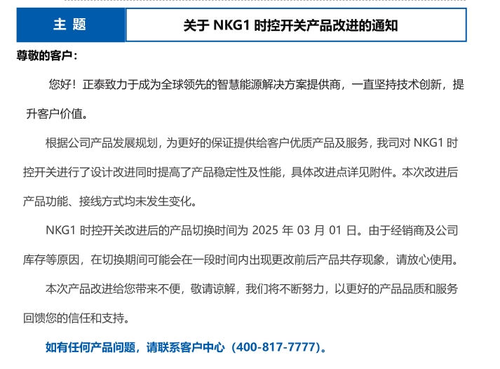 關(guān)于 NKG1 時(shí)控開關(guān)產(chǎn)品改進(jìn)的通知