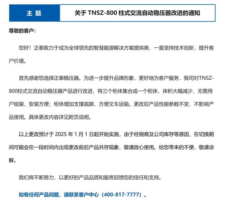 關(guān)于 TNSZ-800 柱式交流自動穩(wěn)壓器改進(jìn)的通知