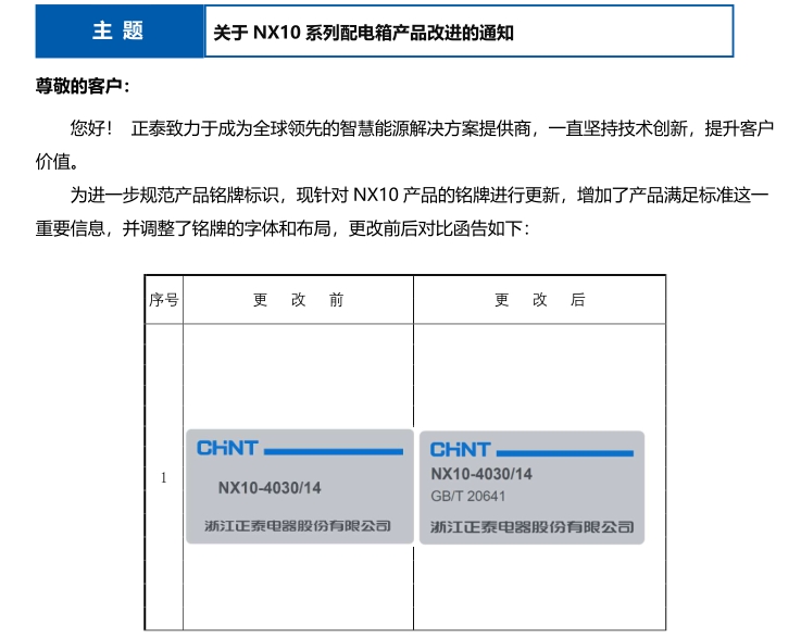 關(guān)于 NX10 系列配電箱產(chǎn)品改進(jìn)的通知