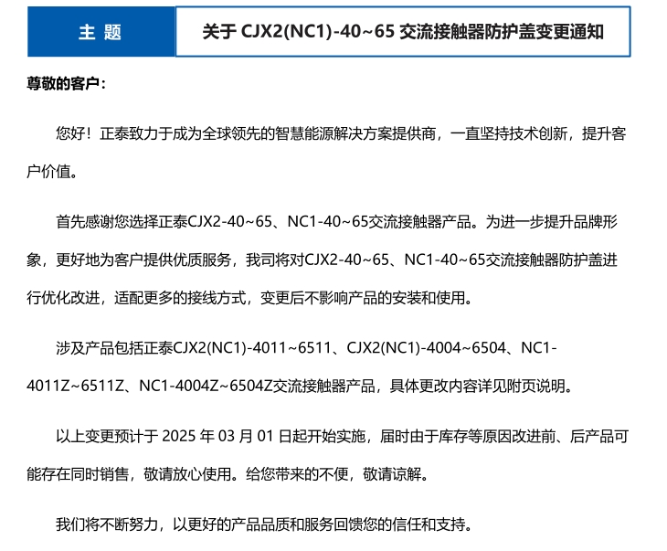 關(guān)于 CJX2(NC1)-40~65 交流接觸器防護(hù)蓋變更通知