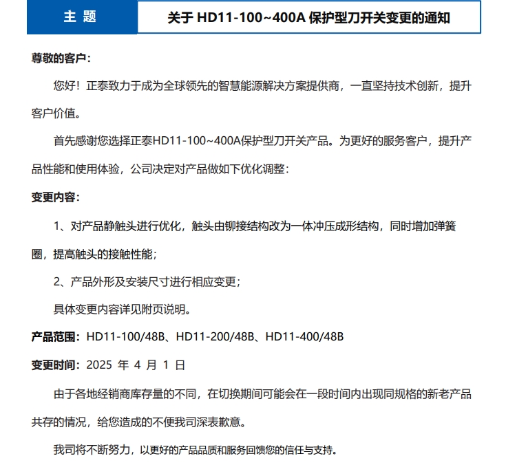 關于 HD11-100~400A 保護型刀開關變更的通知