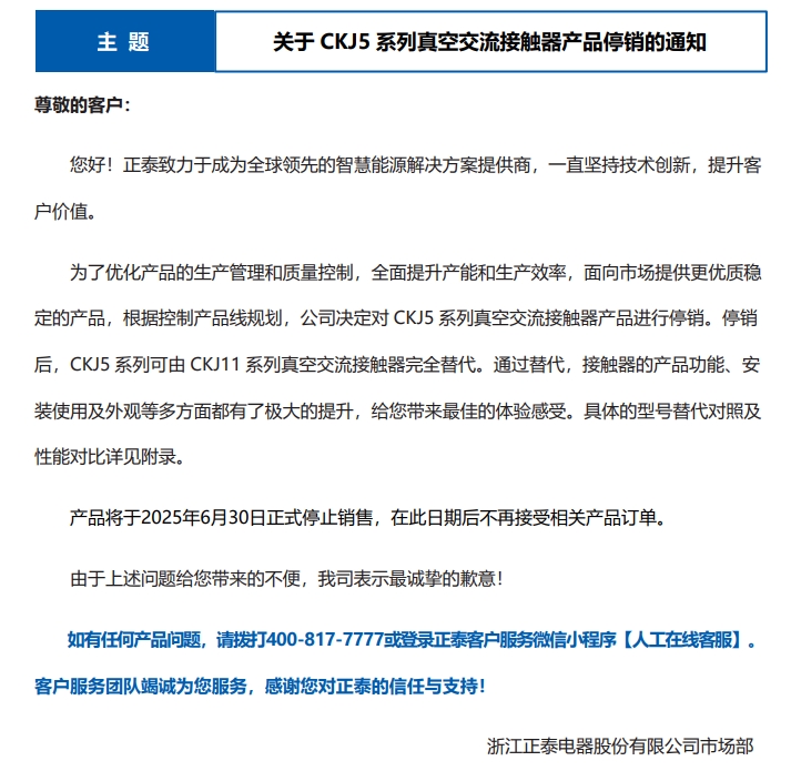 關于 CKJ5 系列真空交流接觸器產(chǎn)品停銷的通知